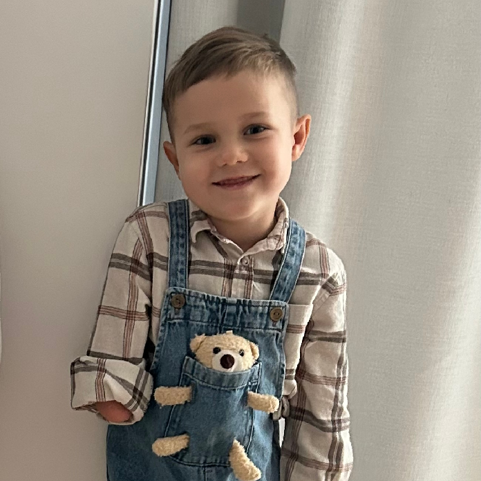 Z uwagi na wrodzony brak przedramienia oraz dłoni prawej ręki potrzebuje protezy nawet do zwykłych, codziennych zabaw.