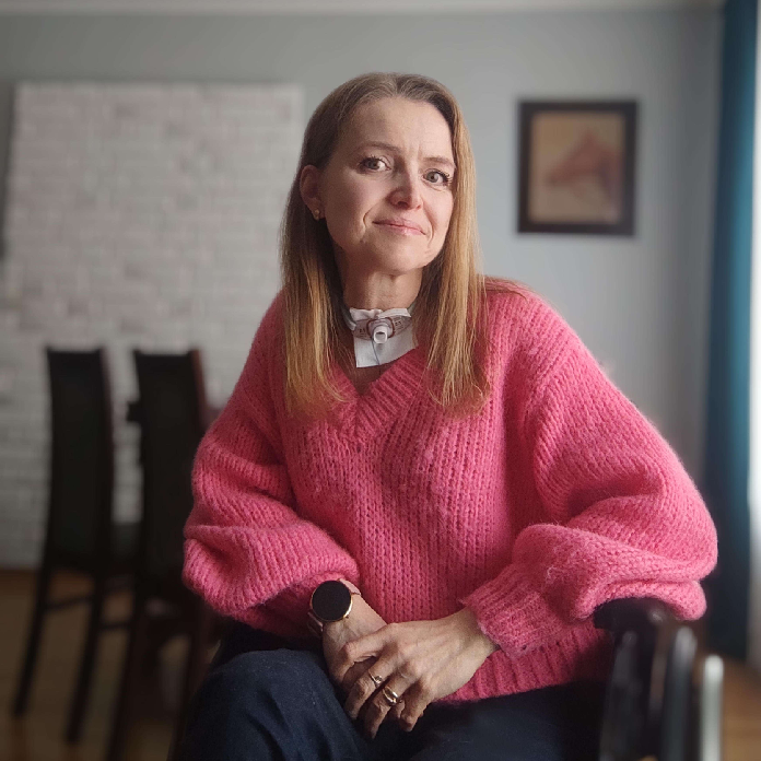 Mam na imię Agnieszka, mam 46 lat. Choruję na dystrofię mięśniową. Do sierpnia 2023 r. poruszałam się jeszcze samodzielnie, niestety przewróciłam się i złamałam kość udową. Konieczna była operacja. Dzień po operacji moje płuca przestały oddychać i byłam intubowana. W tej chwili oddycham przez rurkę tracheotomijną, a w nocy z pomocą respiratora. Poruszam się tylko na wózku.