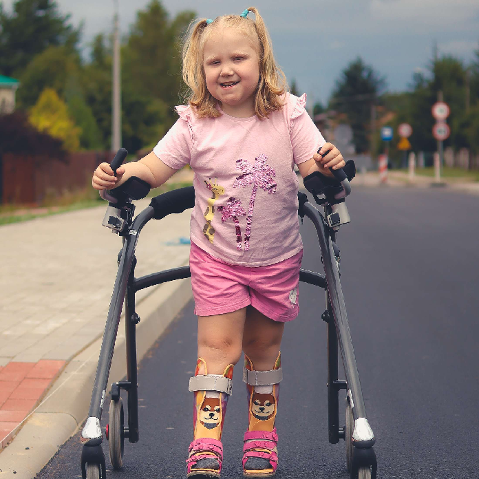 Na chwilę obecną poruszam się na wózku inwalidzkim, ponieważ nie potrafię jeszcze samodzielnie chodzić, ale dzięki sprzętom rehabilitacyjnym robię bardzo duże postępy. Noszę aparaty słuchowe, aby prawidłowo nauczyć się mowy oraz ortezy na nóżkach ułatwiające pionizację.