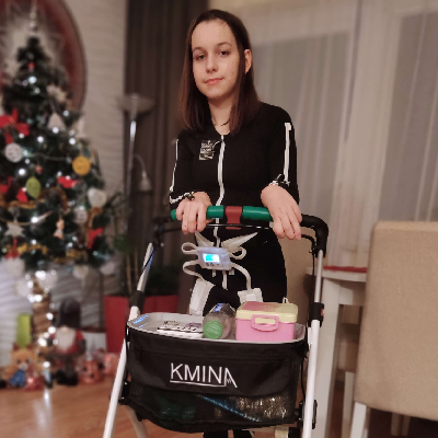 Na małe odległości poruszam się przy pomocy chodzika i kombinezonu MOLLII, który stymuluje moją spastykę zmniejsza jej siłę i napięcie, jakie wywołuje w moim organizmie. Moja samodzielność jest bardzo ograniczona, potrzebuje stałej i intensywnej rehabilitacji.