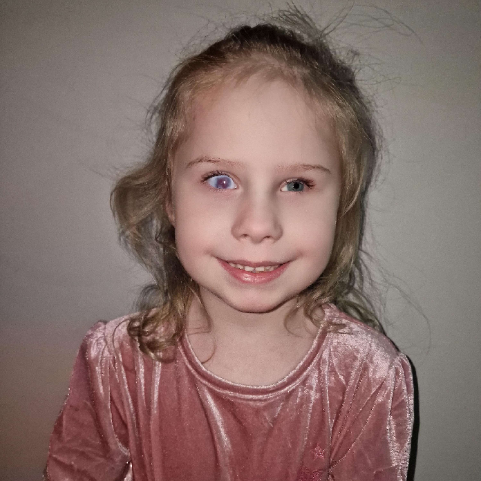 Mam na imię Amelia, urodziłam się z wadą wrodzoną obu gałek ocznych. Na prawe oko niedowidzę w dużym stopniu, stwierdzono Anomalie Petersa, bielmo przedniego zrębu w części obwodowej rogówki. W lewym oku mam epiproteze, którą musze wymieniać.