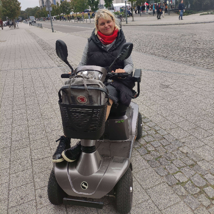 Mam mózgowe porażenie dziecięce czterokończynowe oraz komplet chorób współistniejących. Oddziałują one na całe moje życie i trochę je utrudniają. Od kilku lat poruszam się na dłuższych dystansach przy pomocy kuli łokciowej. W czerwcu 2024 roku kupiłam inwalidzki skuter elektryczny. Jest to bardzo duża zmiana w moim funkcjonowaniu.