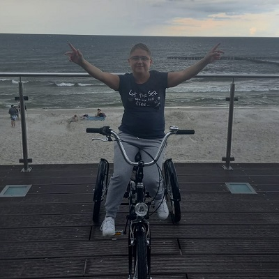 Cześć, jestem Beata. Od urodzenia choruję na dziecięce porażenie mózgowe czterokończynowe, które utrudnia mi poruszanie się.
