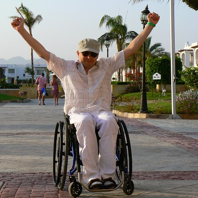 Witam, mam na imię Grzegorz. W wieku 18 lat w wyniku wypadku doznałem złamania kręgosłupa na odcinku szyjnym. Spowodował on u mnie dysfunkcję kończyn górnych i dolnych oraz konieczność poruszania się na wózku inwalidzkim.
