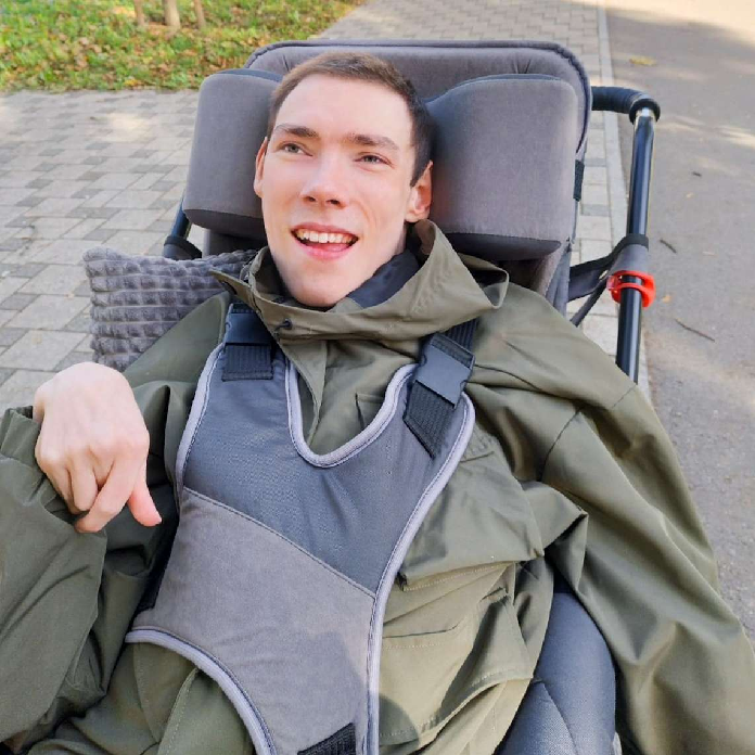 Pomimo swojej niepełnosprawności jest radosnym młodym chłopakiem lubiącym spacery i podróże samochodem.
