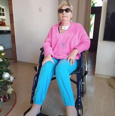 Od 2010 roku nie chodzę i muszę być codziennie podpinana do respiratora w ciągu dnia, gdyż się duszę, a nocki spędzam całe pod respiratorem, gdyż moje płuca ciężko pracują. Jestem osobą wymagającą ciągłej opieki i rehabilitacji.