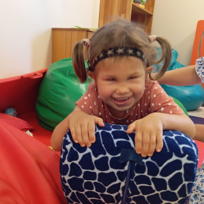 Cześć, mam na imię Julka i w marcu skończę 5 lat. Urodziłam się z bardzo poważnymi wadami wrodzonymi: obustronnym małooczem i głuchotą czuciowo-nerwową, co oznacza, że nie widzę i nie słyszę. Do tego dochodzą zaburzenia integracji sensorycznej, nie potrafię prawidłowo jeść (jem jedzenie w formie papki), brak rozwoju mowy, noszę pampersy oraz mam problemy z chodzeniem – potrzebuję asysty do poruszania się w przestrzeni.