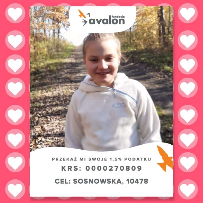 Przekazując 1,5% swojego podaku lub darowiznę Fundacji Avalon z dopiskiem Sosnowska, 10478 wspieracie Państwo Kaję w jej codziennym funkcjonowaniu.