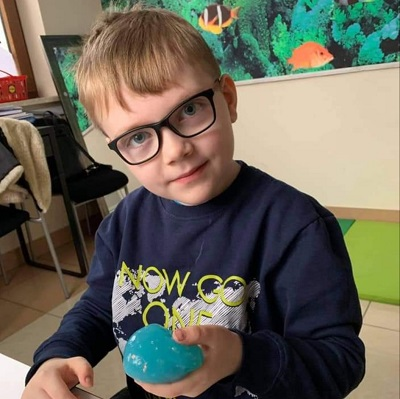 Mateusz nosi okulary z powodu zeza, który jest efektem nacisku guza na nerw wzrokowy. Rozwój Mateusza jest opóźniony, porusza się w specjalistycznych butach ortopedycznych i potrzebuje do tego pomocy dorosłej osoby. Z powodu autyzmu potrzebuje wsparcia w postaci terapii, po których robi postępy. Uczęszcza również na rehabilitację, po której widać efekty. Na co dzień jest wesołym i pogodnym dzieckiem, prosimy o przekazanie 1,5% podatku dla Mateusza, aby mógł dalej się rozwijać.
