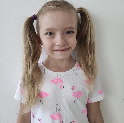 Cześć! Mam na imię Michasia i mam 7 lat. Urodziłam się z zespołem wad genetycznych Goldenhara. Nie mam stawu skroniowo-żuchwowego, mam porażenie nerwu twarzowego, delikatną deformację podniebienia, silną asymetrię i skoliozę. Nie mam środkowego ucha oraz małżowiny.