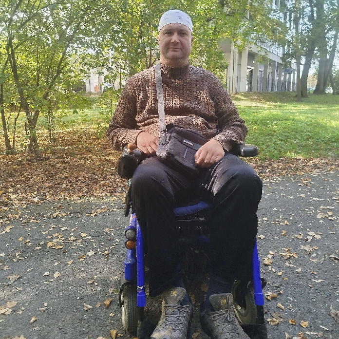 Mam na imię Oleksandr, mam 40 lat. W 1998 roku zdiagnozowano u mnie stwardnienie rozsiane, przez co teraz poruszam się na wózku inwalidzkim. Choroba ta atakuje układ nerwowy, powodując demielinizację włókien nerwowych w mózgu i rdzeniu kręgowym.