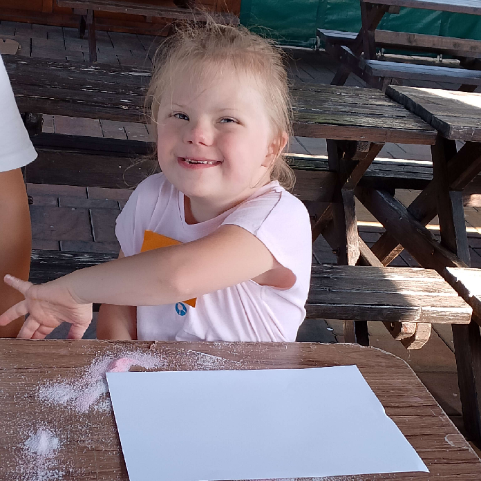 Nasza córeczka Olga urodziła się 28.11.2017 roku. Po szczegółowych badaniach stwierdzono u niej Zespół Downa, obniżone napięcie mięśniowe i problemy ze słuchem wynikające z wąskich kanalików słuchowych. W wieku roku pojawiły się problemy z oczami – przeszła dwa zabiegi korygujące zeza i ustawienie głowy. Olga ma krótkowzroczność, astygmatyzm, brak widzenia obuocznego i przestrzennego.