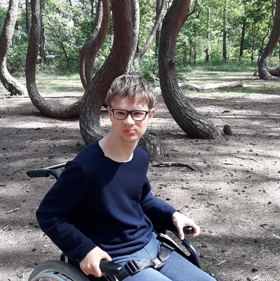Jestem Piotrek. Urodziłem się z zespołem wad wrodzonych. Nie mówię, wymagam wsparcia przy każdej czynności ale dzięki rehabilitacji nie jestem osobą leżącą i potrafię w domu poruszać się na nogach samodzielnie.