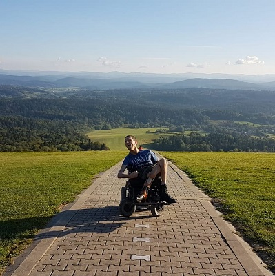 Mam na imię Piotr i choruję na mózgowe porażenie dziecięce. Mam porażone wszystkie kończyny i zaburzoną mowę. Nie chodzę, jeżdżę wózkiem elektrycznym sterowanym stopą.