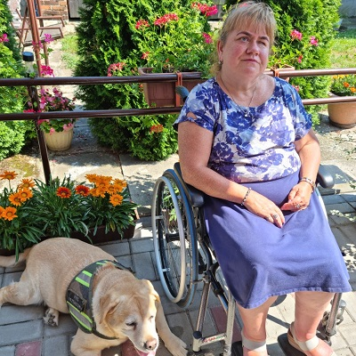 Poruszam się na wózku. Kilkanaście lat temu straciłam wzrok w jednym oku, na drugie widzę zaledwie w 10%. Mieszkam sama. W zmaganiach z problemami codzienności pomaga mi pies asystent Nefi, który powinien już przejść na psią emeryturę. Aby żyć w miarę normalnie potrzebuję pomocy asystentów, odpowiednio dostosowanego domu, otoczenia i sprzętu. Mimo trudności dnia codziennego, jestem osobą pogodną i staram się być aktywna.