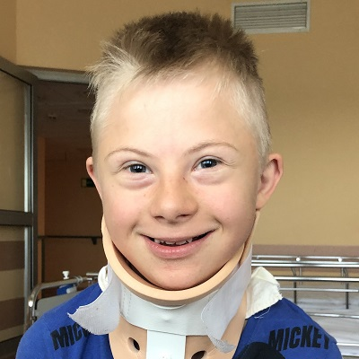 Tomuś, radosny uśmiechnięty wysportowany chłopiec z zespołem Downa, któremu teraz w wieku 12 lat uraz szyi spowodował trwały uszczerbek na zdrowiu.