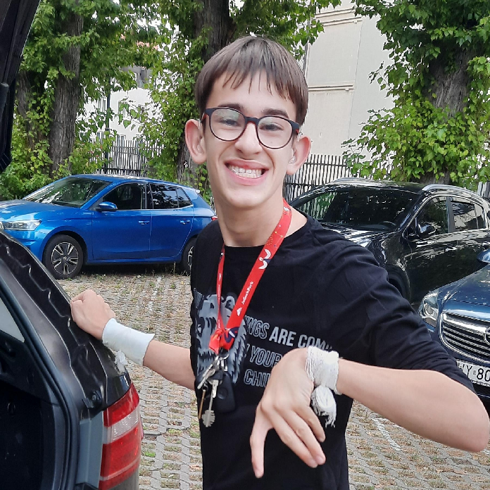 Od dzieciństwa mam bardzo dużo zajęć – zarówno sportowych, jak i edukacyjnych! Bardzo kocham sport, gry komputerowe i motocykle! Ale mama mówi, że żeby jeździć na motocyklu, najpierw muszę nauczyć się chodzić. To jest mój cel! Dlatego potrzebuję stałej rehabilitacji: ćwiczeń fizycznych, pływania, hipoterapii. A żeby móc słyszeć (noszę stale aparaty słuchowe), trzeba co 3–5 lat kupować nowe aparaty słuchowe na oba uszy.
